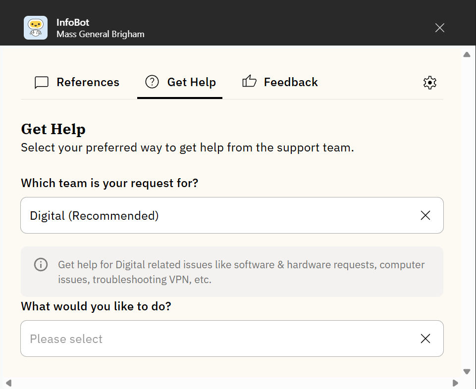 InfoBot is MGB’s intelligent AI assistant designed to simplify IT and HR support. Think of it as your always-available workplace companion, helping you quickly find information and complete tasks across your organization.