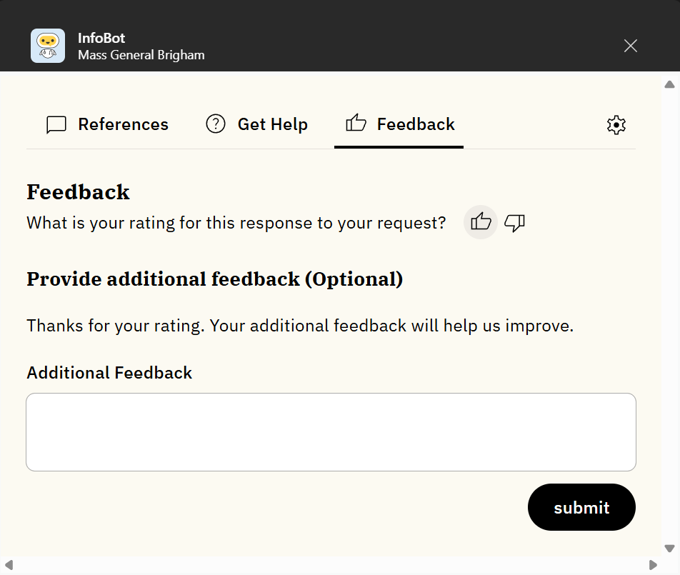 Click on the thumbs up or thumbs down buttons at the bottom of an InfoBot prompt to share any feedback. All comments and suggestions are appreciated!