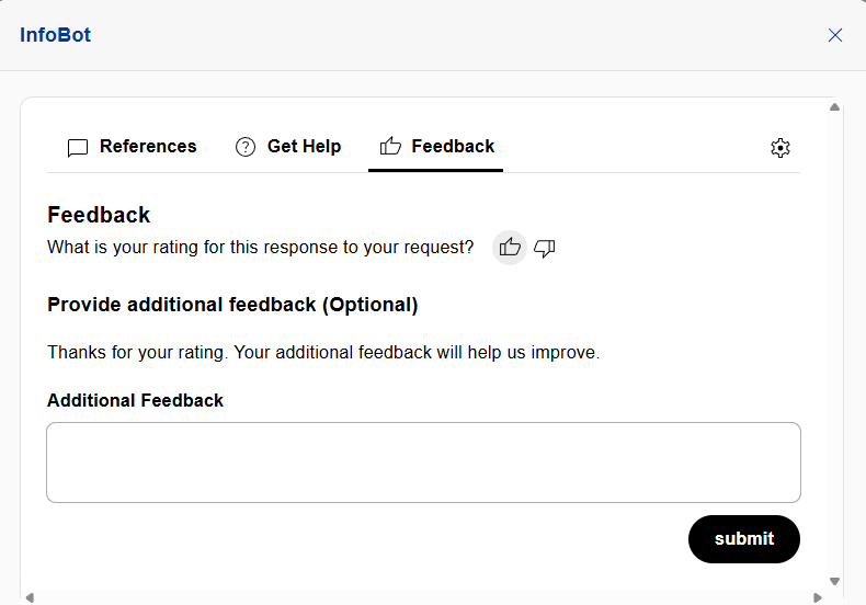 Click on the thumbs up or thumbs down buttons at the bottom of an InfoBot prompt to share any feedback. All comments and suggestions are appreciated!