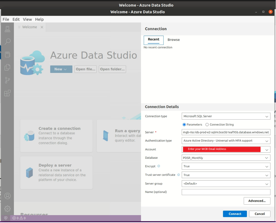 You may receive an error while trying to connect to the PDSR database with Azure Data Studio as shown the screen capture below: