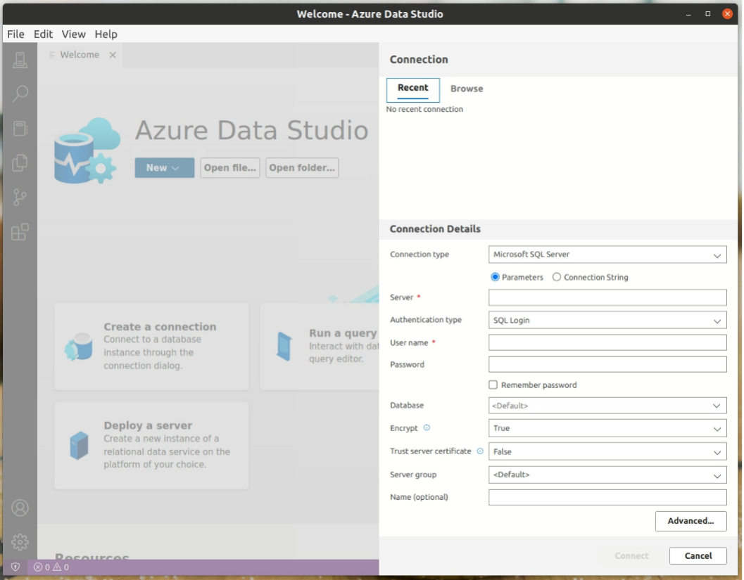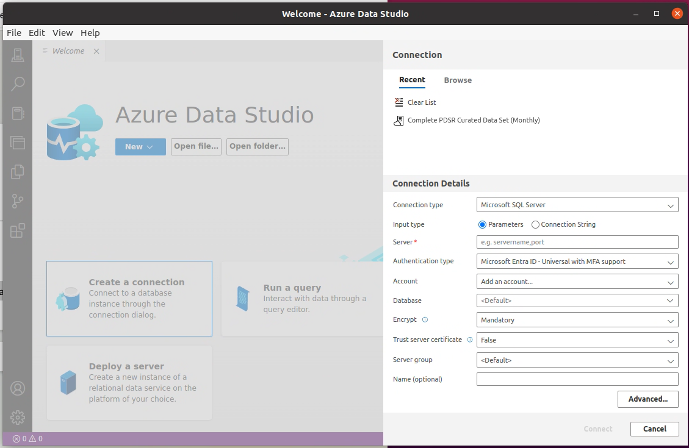 2. A Connection Dialog will appear, prompting you to enter the required connection details. Please note that users operating Azure Data Studio version 1.48.1 or later will observe changes in how Connection Details are displayed. These updates correspond with Microsoft’s transition from Azure AD to Microsoft Entra ID (https://learn.microsoft.com/en-us/entra/fundamentals/how-to-rename-azure-ad).