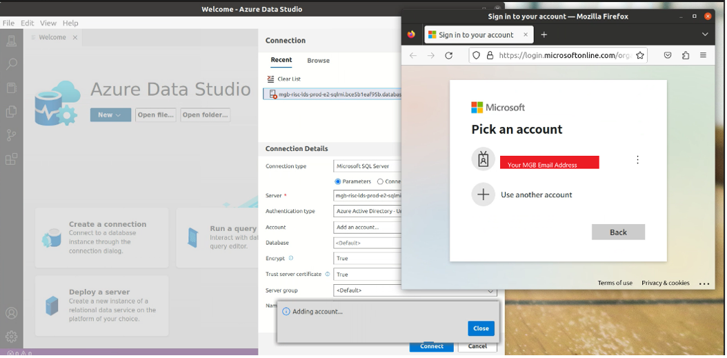A browser dialog will appear, prompting you to choose an account for Azure authentication.