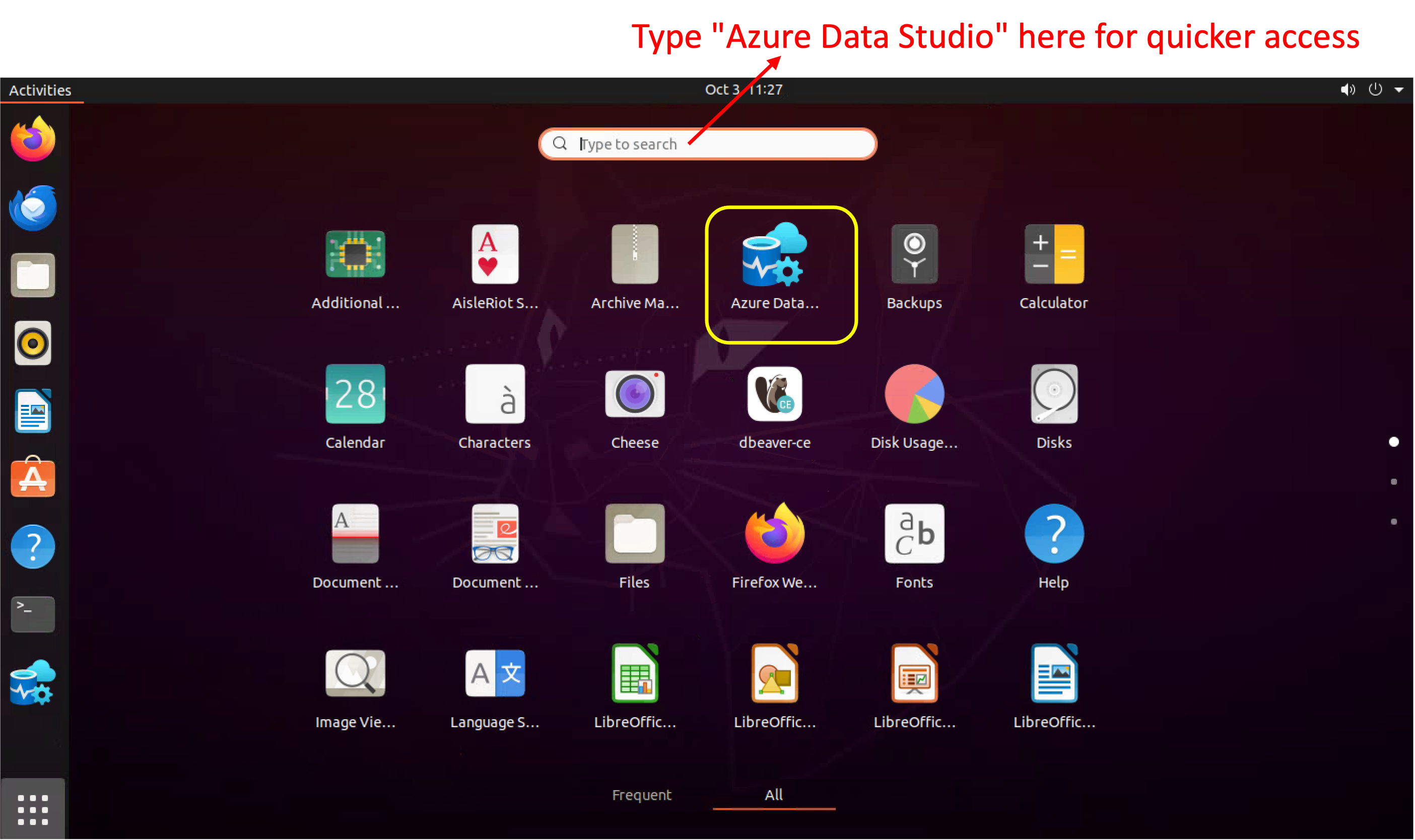 To launch Azure Data Studio, either execute the `azuredatastudio` command in Bash or select the Azure Data Studio icon from your applications menu.